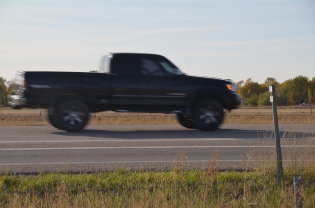 The differences between frozen motion and motion blur can be striking. It’s obvious that this pickup truck is moving down the highway. But when the camera focuses on another object (whether it be in motion or not in motion) such as the metal pole on the roadside, the shape of the larger object can be easily blurred.