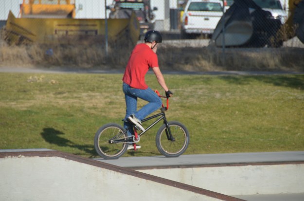 Now notice this distinctly different example of motion blur. Here, the boy in the red shirt is getting ready to do a bike trick. He is more in focus than the sidewalk and the vehicles behind the fence, which are not so focused up. But, this indeed still counts as motion blur.